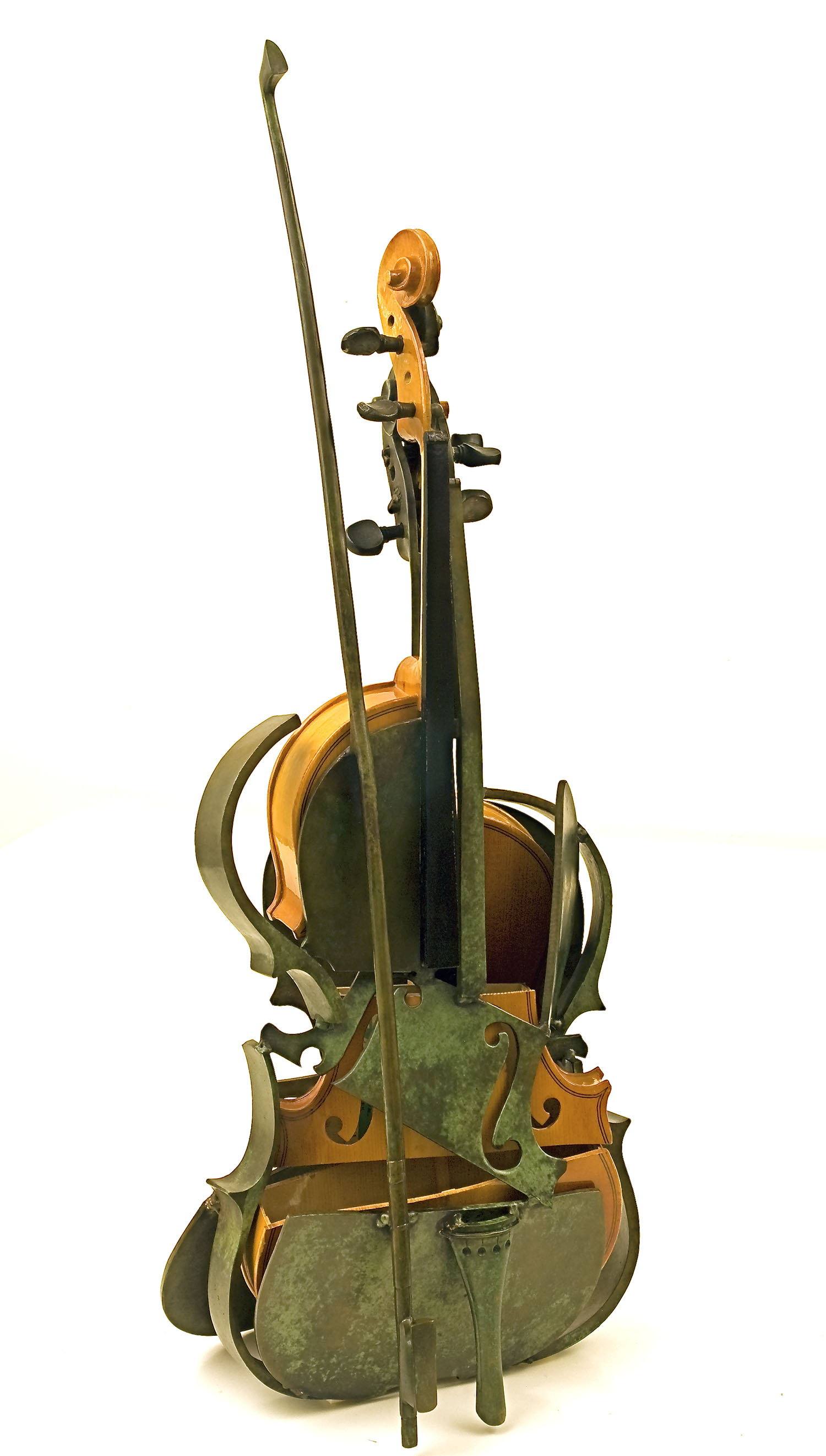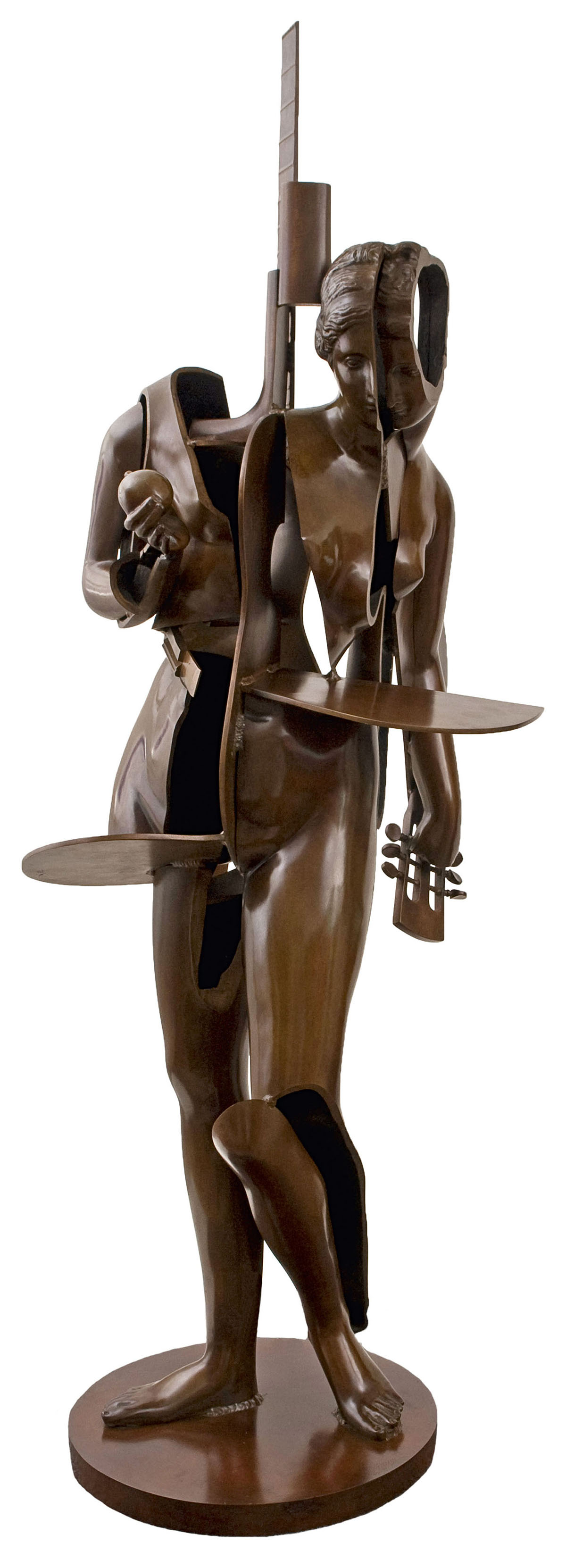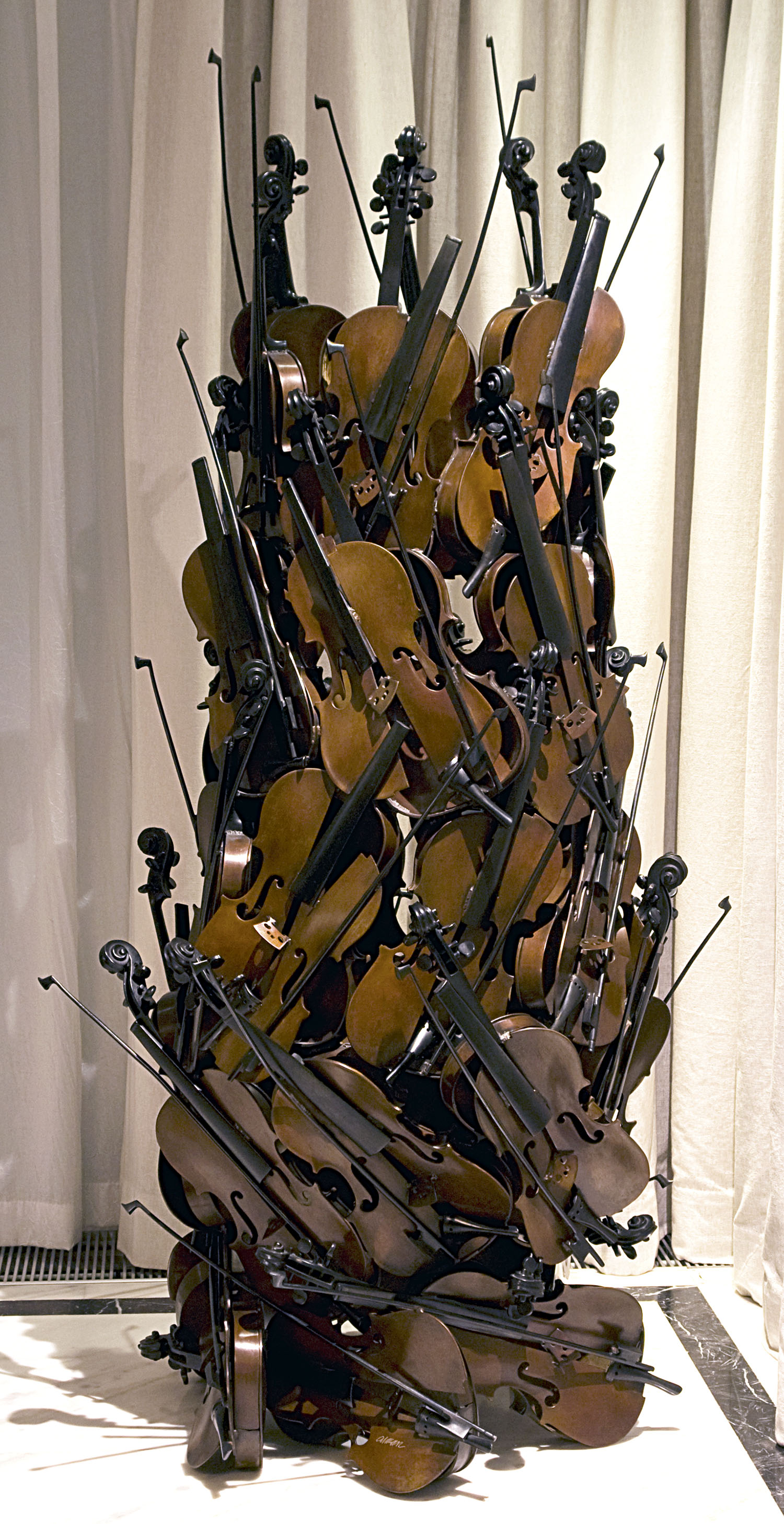 Arman was a member of Nouveau Réalisme, the famous French avant-garde movement (1960 – 1963). The protagonists of this heterogeneous group were united in a new approach to the perception of reality, meant to balance humanistic ideals with industrial expansion. The artistic language contained various forms of collected fragments of reality, the best known being accumulations, assemblages and collages, and packaging and compressions. At the end of the 1950s he began to develop his most recognisable style in Accumulation and Poubelle. Accumulations were collections of common and identical objects which he arranged in polyester castings or within Plexiglas cases. He created varied accumulations, using the most diverse objects and materials, with polyester, cutting, welding, singeing and casting in concrete and synthetic marble. In the 1970s he began to work with destructed musical instruments embedded in concrete or cast in bronze. One of the exhibitions showing his Arman with Orchestra (1983) indicates a new aesthetic in his concept. Arman often used classical motifs and destructed and accumulated them into an art object. In his sculpture – object Hermes and Dionysus from the series Gods and Goddesses he engaged in polemics with traditional form and the classical ideal of beauty. He cut the sculpture into several parts, opened up its interior and integrated it with the surrounding space.