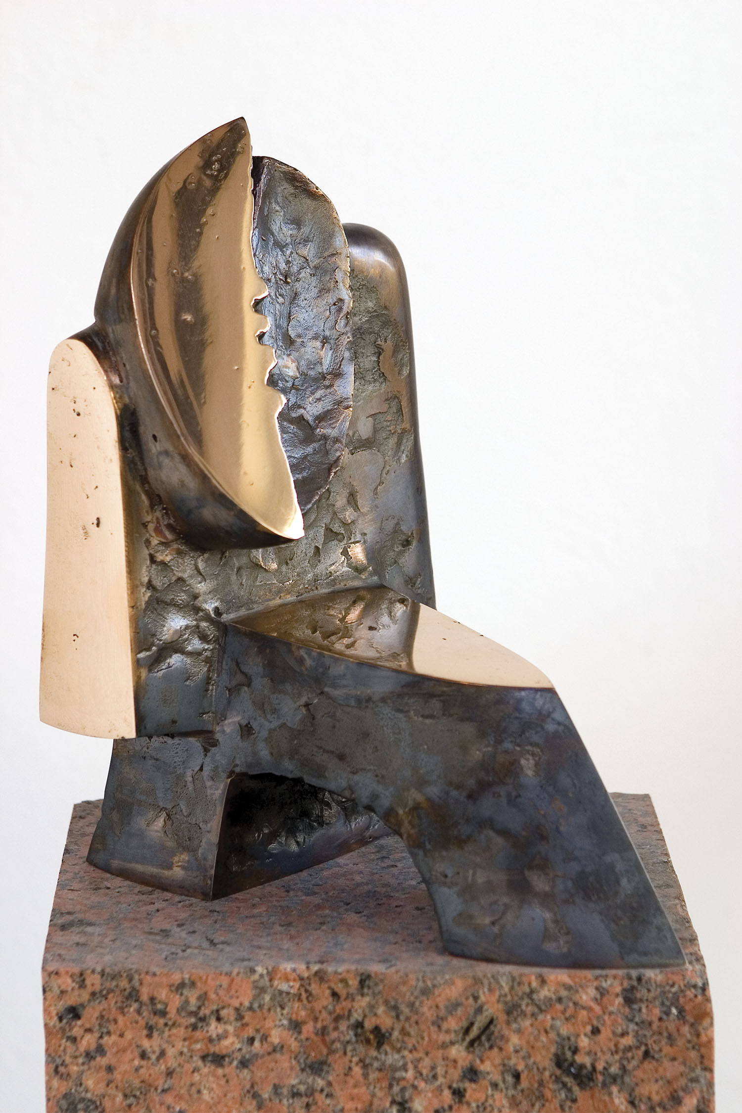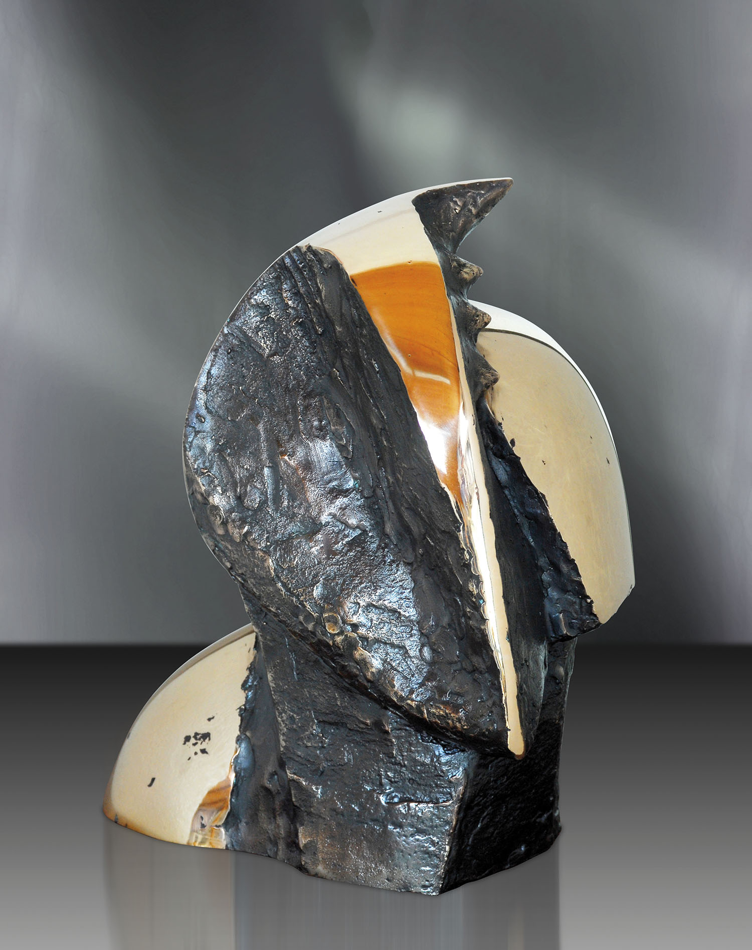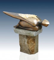 The sculptor Oto Bachorík exploits two principal methods: sculpting and modelling. The technical approach of his choice determines the selection of materials: he prefers chiselling stone, carving wood or modelling clay and plaster. Most of his sculptures are cast in bronze. He has a preference for the motifs of female figures, proud rulers, victors, protectors and guardians. Their distinctive monumentality and majestic integrated sculptural form is reminiscent of the elements of archetype and the mythological legacy of history. Their matte surface radiates magical shimmering, rough dramatic structures and the combination of both. Temptation is a sculpture from the series of female figural compositions, conceived as a modern mermaid – part woman and part fish. Its slender almost dematerialised body radiates tranquillity and symbolises eternal messages. It is the guardian of the land where our unsettled history was written.