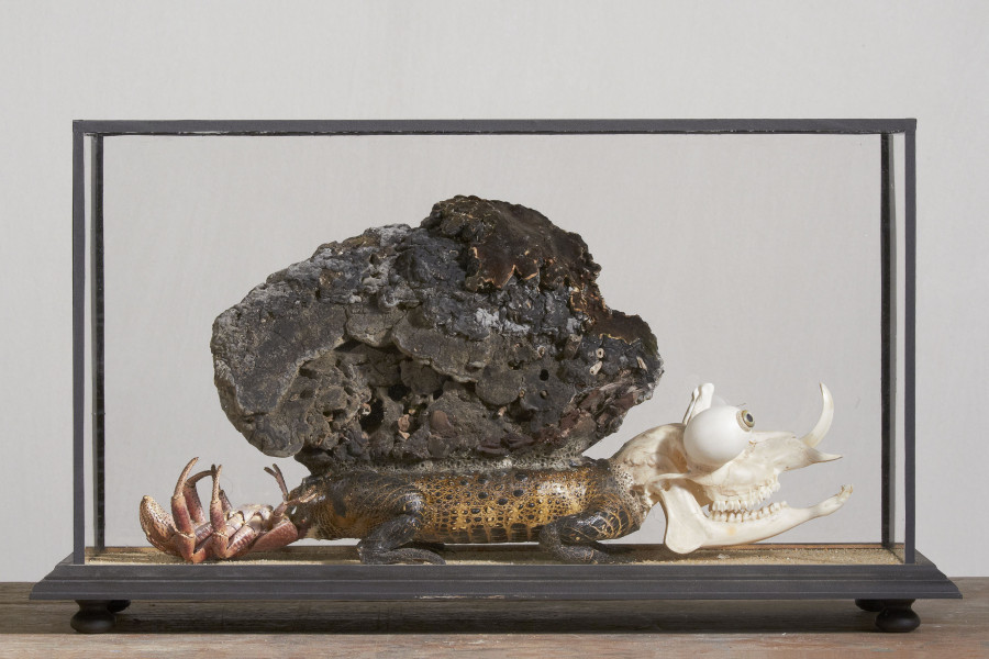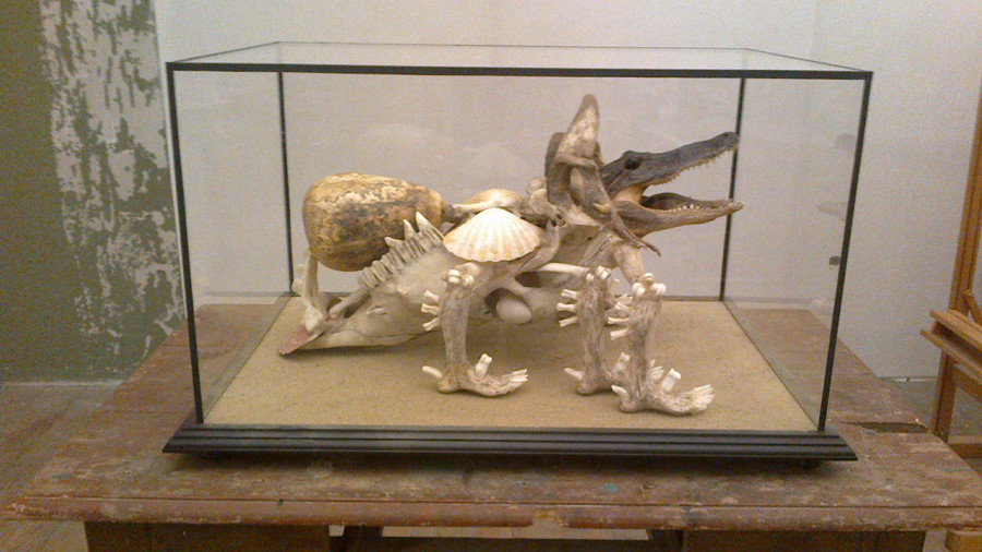 Unconventional thinking and an untamed imagination have driven Švankmajer’s work from the very beginning. Trained in puppetry, he inclined toward a magical game with fetishes and the transformation of reality into magical, dream-like illusions. This transformation was based on the creation of new wholes composed of real objects on the principle of Dadaistic objets trouvés. He included the results of his collecting in his cabinet of curiosities, and driven by his imaginative compulsion, he created new zoological monsters which resulted in a “Natural History Cabinet.” The method of their construction and presentation in exhibition cases of natural history cabinets creates a real illusion. They were created at the beginning of the 1970s in various forms, either as objects or flat artwork, collages, prints and paintings. The flat artwork that preceded objects are included in Švankmajer´s Bilderlexikon, a kind of alternative zoology which mystifies the present and the past. According to Švankmajer, realistic detail is important and the more realistic, the more it multiplies the fantastic effect and helps to penetrate its internal depths.